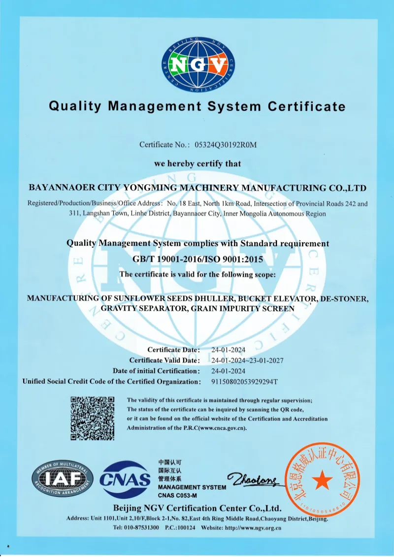 ООО Баяннур Юнмин Машиностроение (ранее известное как Юнмин Машиностроение) было основано в 2004 году. Штаб-квартира компании находится в городе Баяннур, автономном районе Внутренняя Монголия Китая, который является одним из основных мировых центров производства семян подсолнечника. Компания является ведущим производителем сельскохозяйственной техники. Наша основная деятельность охватывает производство линий для шелушения, сепарации, очистки и глубокой переработки семян, а также поставку соответствующего вспомогательного оборудования для удовлетворения потребностей мирового сельскохозяйственного рынка.