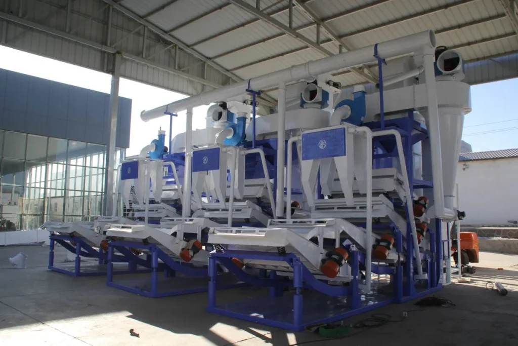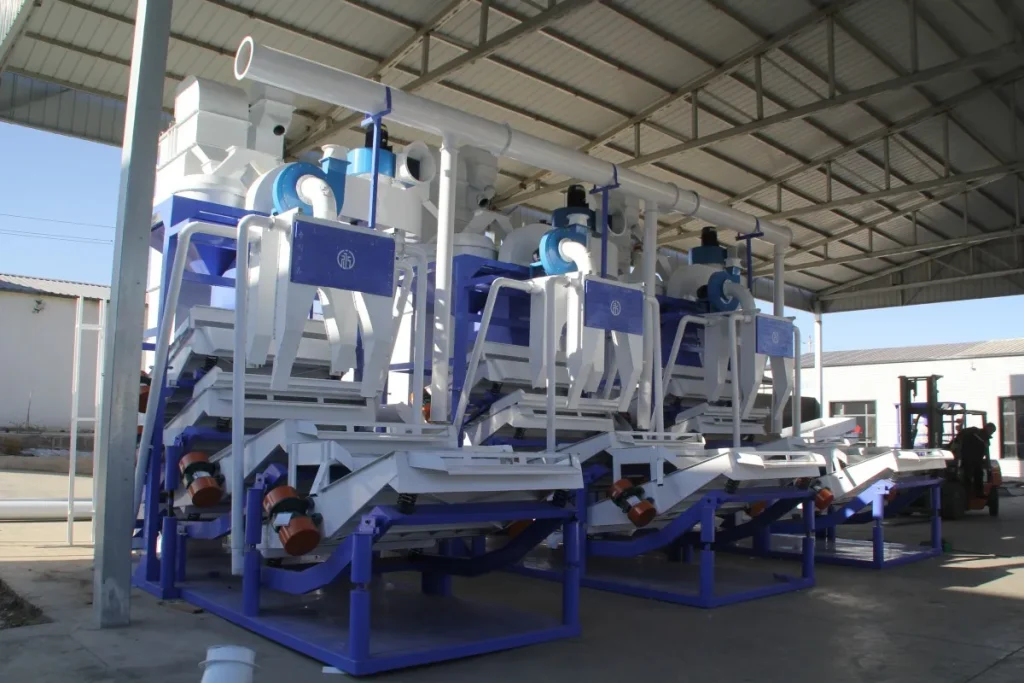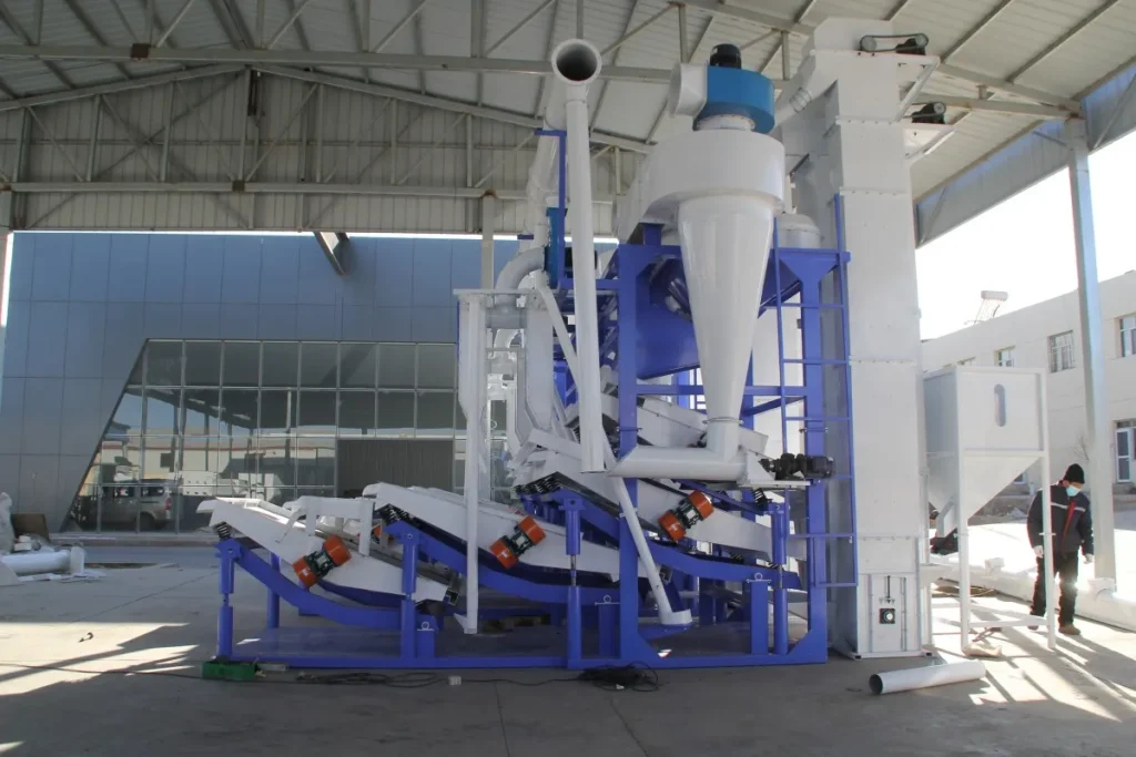 Оснащена подвесным сепаратором, циклонным пылеуловителем и двойными вибрационными ситами для тщательного отделения лузги от ядер. Нелущеные семена автоматически возвращаются в лущильную машину с помощью подъемника без дробления, сокращая отходы и повышая эффективность переработки.